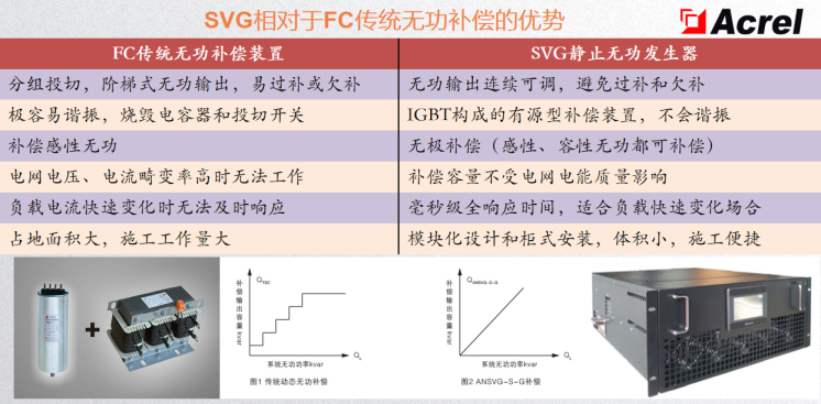 Có nhiều loại thiết bị bồi thường, và sự lựa chọn thường dựa trên thiết bị hoạt động thực tế tại trang web. Mỗi thiết bị bồi thường có những ưu điểm và nhược điểm riêng của nó. Trong bài viết này, chúng tôi sẽ giới thiệu ngắn gọn hai sản phẩm được sử dụng rộng rãi nhất trong hệ thống phân phối 0,4KV trên thị trường: bồi thường tụ chuyển mạch (bồi thường FC) và máy phát var tĩnh (bồi thường SVG).