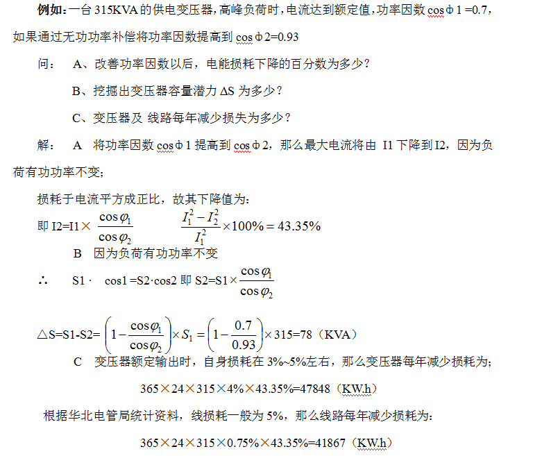 Nếu không có đủ công suất trong máy biến áp và đường dây, phương pháp lắp đặt các thiết bị bù điện phản ứng có thể được sử dụng. Lắp đặt các thiết bị bù điện phản ứng có thể cân bằng điện phản ứng tại địa phương, làm giảm dòng chảy qua đường dây và máy biến áp, làm chậm tốc độ lão hóa của dây và cách điện máy biến áp và kéo dài tuổi thọ của chúng.Đồng thời, nó có thể giải phóng công suất của máy biến áp và đường dây, tăng khả năng mang tải của chúng. Ví dụ, với máy biến áp 100KVA hiện đang hoạt động ở mức tải 85% với COSΦ 0,7, lắp đặt thiết bị bù điện phản ứng có thể tăng khả năng chịu tải của máy biến áp lên 30%. Người dùng có thể tăng tải của họ mà không mở rộng công suất để tạo điều kiện cho việc mở rộng sản xuất hơn nữa.
