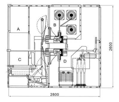 | Kích thước (W WxDxH): 1400x2800x2600 | S / Sơ đồ cấu trúc của thiết bị chuyển mạch A. Phòng dụng cụ rơle B Phòng xe buýt C Phòng ngắt mạch D Cáp |